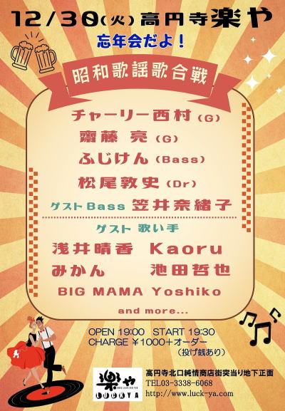 12/28(日) 忘年会ライブ@戸越銀座 あかだ
